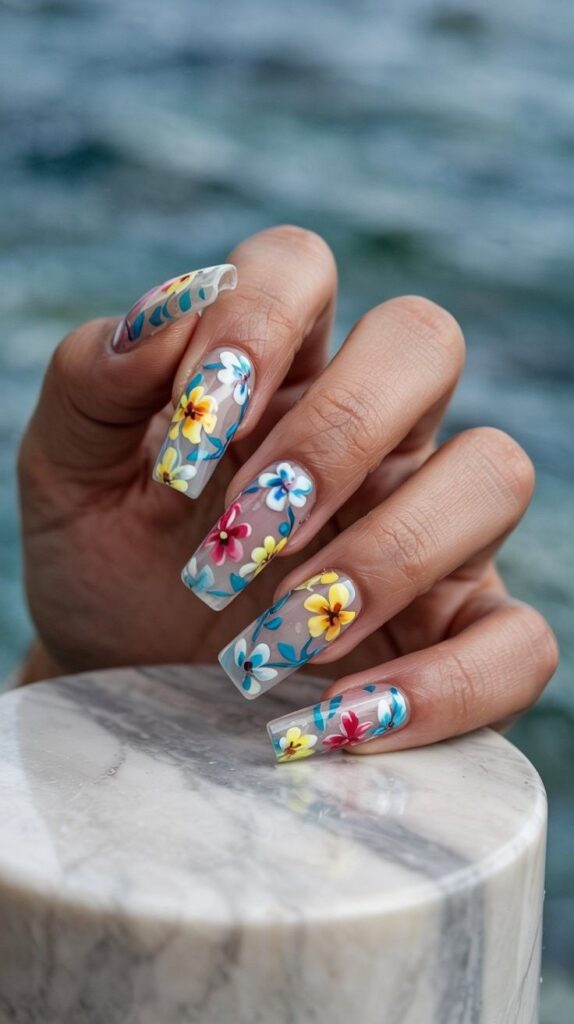 Transparent short almond nails in sheer nude base, adorned with hand-painted mini blossoms in coral, yellow, blue, and pink—each connected by fine green vines and delicate watercolor washes. The glossy finish enhances the dimension, and the elongated shape flatters every hand. Poetic, lush, and full of wildflower energy—like a secret garden in miniature.
