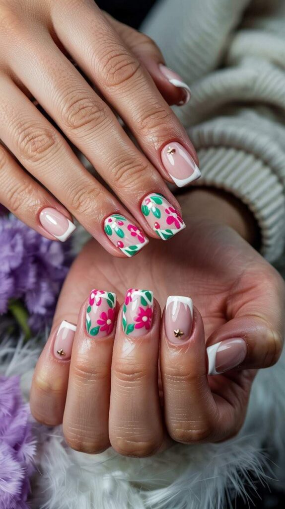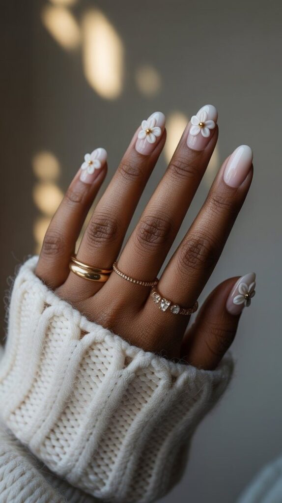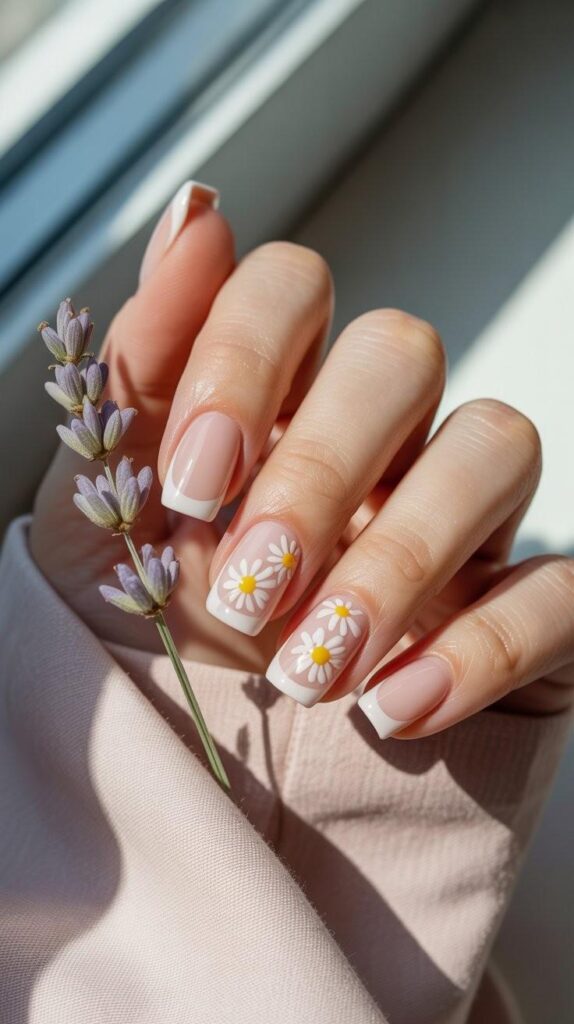 3) Nude French Tips with Daisy Clusters