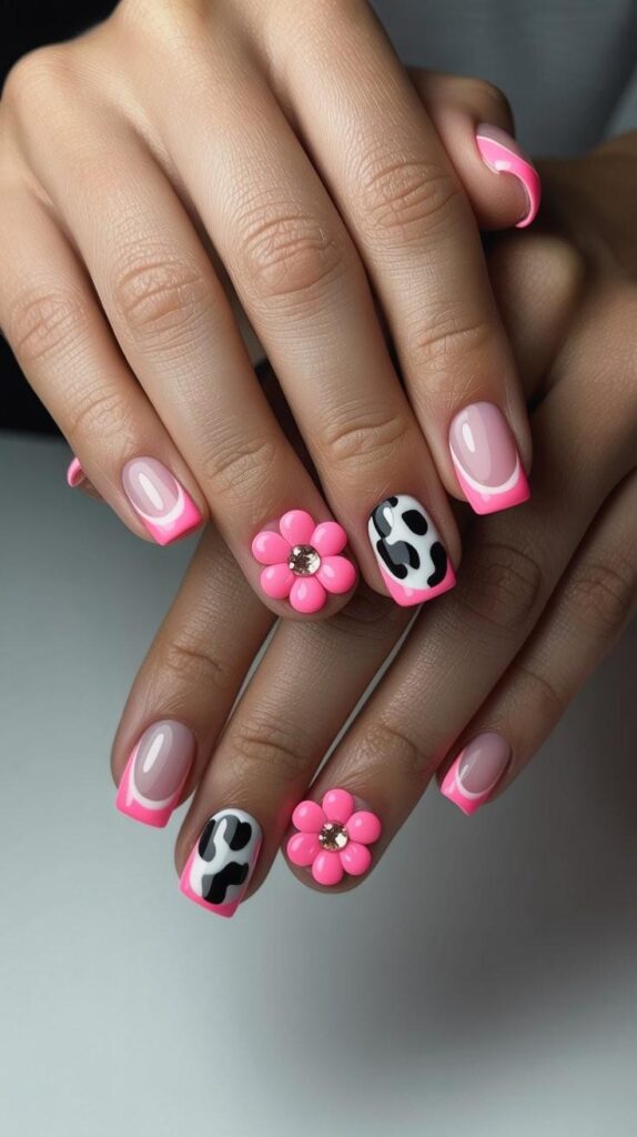 9) Pink French Tips with Cow-Print & 3D Flowers