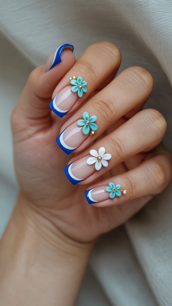 1) Blue French Tips with 3D Floral Accents