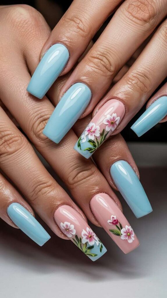 Glossy short oval nails in serene sky-blue, two accent fingers featuring hand-painted delicate pink blossoms with green leaves and subtle watercolor washes. The high-shine finish enhances the contrast, and the oval shape ensures comfort and elegance. Serene, romantic, and full of gentle promise—like clear skies over blooming fields.