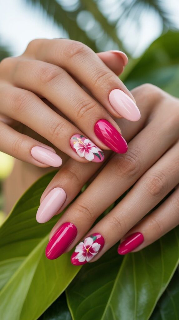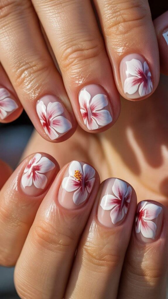 Soft nude-cream short squoval nails, two accent fingers featuring hand-painted vibrant pink hibiscus blossoms with white centers, green leaves, and fine black-outline detailing. The glossy finish enhances the vibrancy, and the compact shape ensures all-day wearability. Confident, tropical, and deeply joyful—like summer’s first bloom, worn with grace.