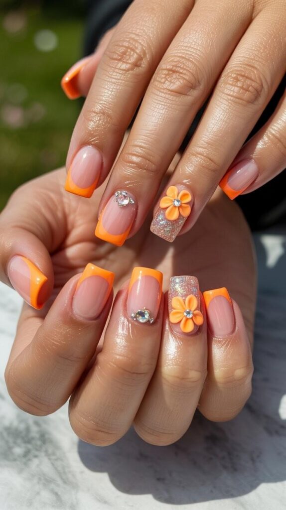Soft nude-cream short square nails with crisp coral-orange French tips, two accent fingers featuring raised 3D orange blossoms with crystal centers and micro-glitter accents. The glossy finish unifies the palette, and the crisp square shape ensures modern elegance. Bold yet tender—joy with texture and light.
