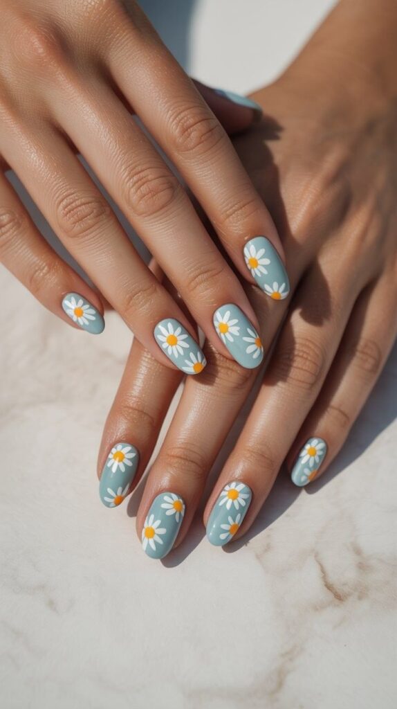 Sheer sky-blue short squoval nails adorned with scattered hand-painted white daisies (yellow centers) and fine green stems—playful, cohesive, and full of springtime joy. The glossy finish unifies the palette, and the compact shape ensures all-day wearability. Delicate yet confident—like a meadow under clear skies.