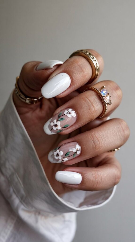 Glossy short almond nails in sheer nude base, two accent fingers featuring hand-painted white blossoms with fine green stems and subtle negative-space detailing—paired with elegant gold rings. The high-shine finish enhances the delicacy, and the elongated shape flatters every hand. Serene, refined, and full of quiet intention—like a love letter written in petals.