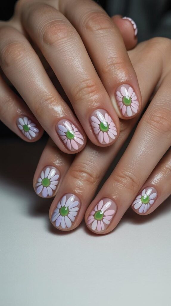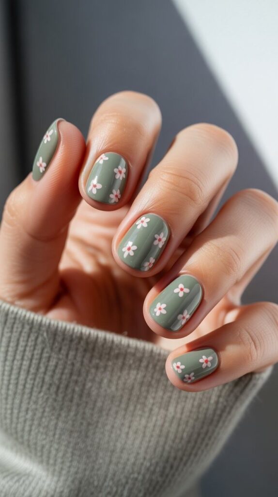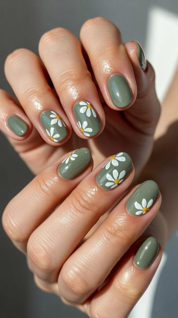 Glossy short oval nails in soft sage-green base, adorned with scattered hand-painted mini daisies (soft pink centers, white petals) and fine green leaf accents. The high-shine finish makes the colors glow, and the oval shape ensures comfort and elegance. Serene, earthy, and deeply calming—like forest floor after rain.