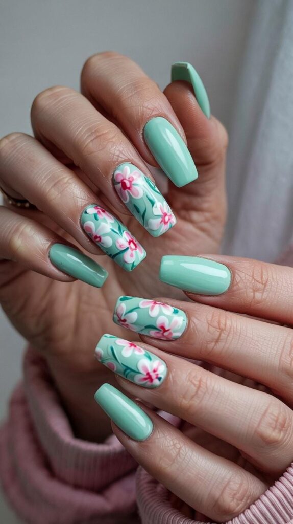 Sheer mint-green short squoval nails, two accent fingers adorned with hand-painted mini pink blossoms (yellow centers), fine green stems, and delicate negative-space detailing. The glossy finish makes the colors glow, and the compact shape ensures all-day wearability. Fresh, joyful, and deeply cohesive—like a meadow in pastel light.