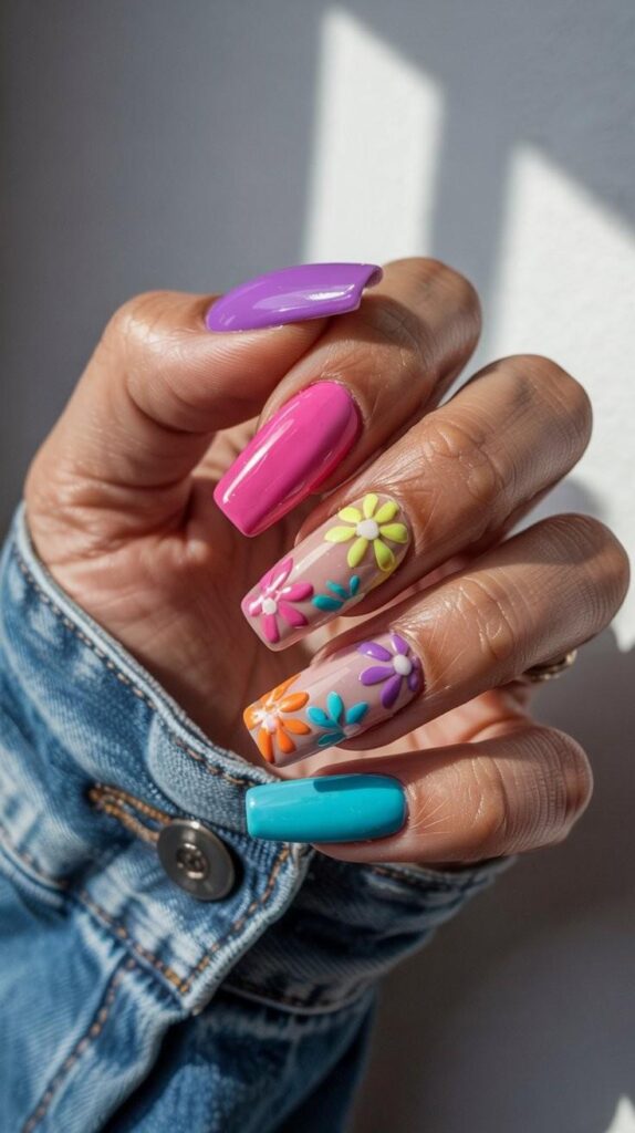 Glossy short almond nails in sheer nude base, adorned with hand-painted mini blossoms in violet, coral, turquoise, and lemon—each with fine green stems and subtle watercolor washes. The high-shine finish unifies the palette, and the elongated shape flatters every hand. Playful, lush, and full of wildflower energy—like a secret garden captured in light.