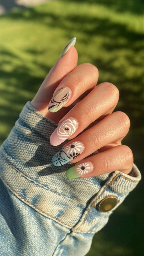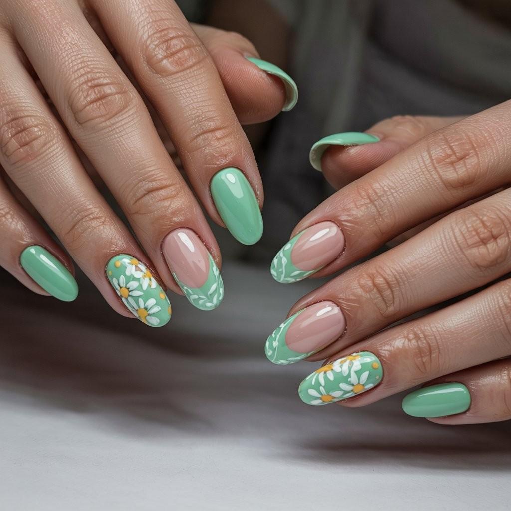 Glossy short almond nails in sheer nude base with crisp mint-green French tips, two accent fingers featuring hand-painted white daisies (yellow centers) and fine green vine details. The high-shine finish enhances the freshness, and the elongated shape flatters every hand. Calm, cohesive, and full of April rhythm—like morning mist over new growth.