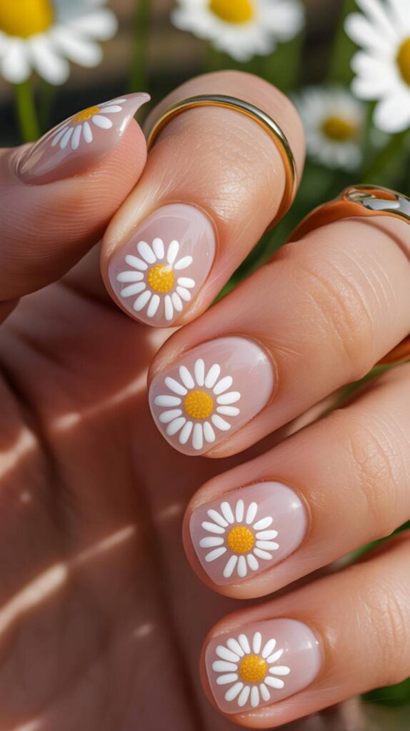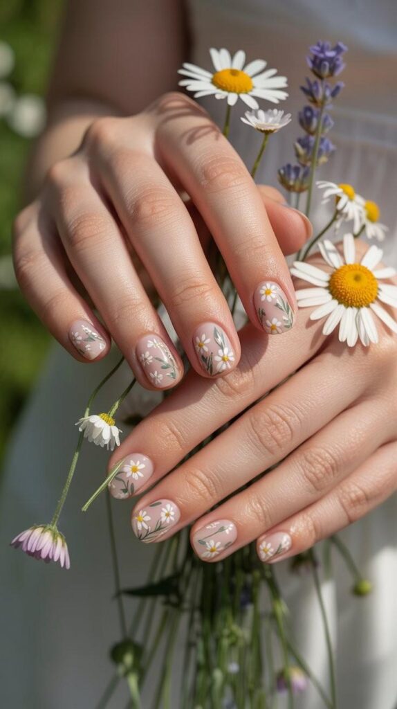 Glossy short almond nails in sheer nude base, adorned with scattered hand-painted white daisies (yellow centers) and fine green vines—paired with real daisies and lavender sprigs held gently in the hand. The high-shine finish enhances the natural harmony, and the elongated shape flatters every hand. Poetic, immersive, and deeply intentional—beauty that breathes with life.