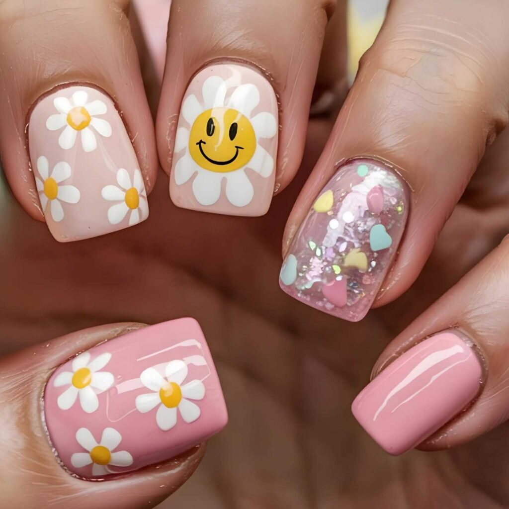 Sheer nude short almond nails, two accent fingers featuring a hand-painted daisy with a cheerful yellow smiley-face center (black eyes & curve), and one with iridescent pastel heart-shaped glitter + micro-confetti in pink, mint, and gold. The glossy finish seals the sparkle, and the elongated shape flatters every hand. Playful, radiant, and full of childlike wonder—optimism, made tactile.