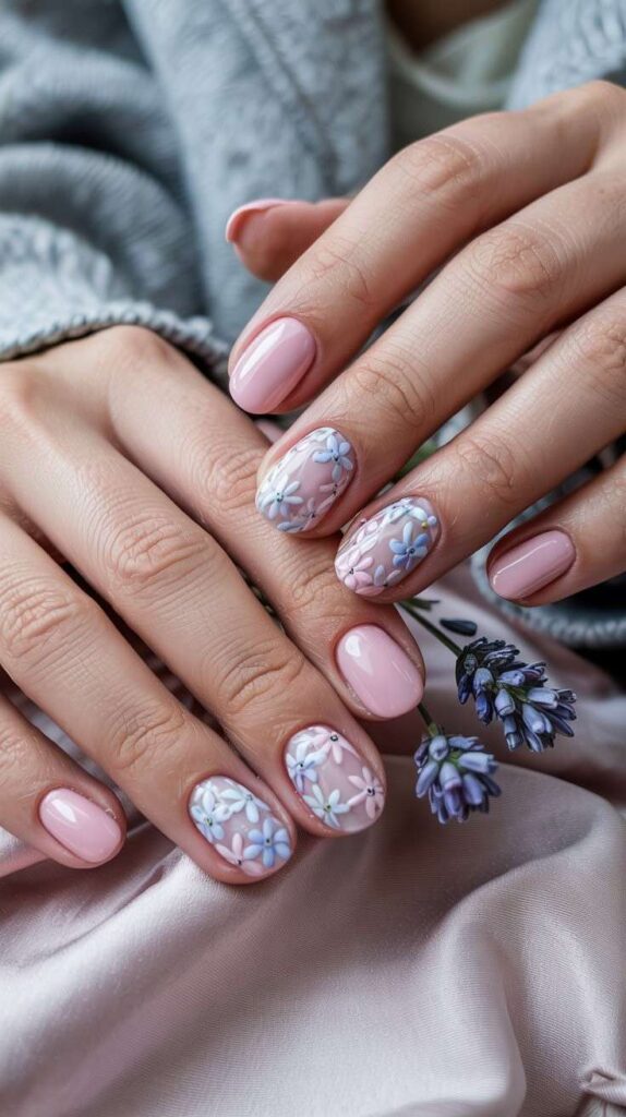 Glossy short oval nails in soft blush base, two accent fingers featuring hand-painted delicate pink and ivory blossoms with fine green leaves—and one with a tiny sprig of real lavender resting beside the hand. The high-shine finish enhances the softness, and the oval shape ensures comfort and elegance. Serene, aromatic, and deeply grounding—like stillness after rain.