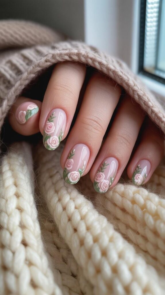 Glossy short almond nails in soft nude base, two accent fingers featuring delicate hand-painted pink roses with green vines and subtle watercolor depth—framed by a cozy ivory knit sleeve. The high-shine finish enhances the tenderness, and the elongated shape flatters every hand. Intimate, comforting, and full of quiet love—like a hug in polish form.