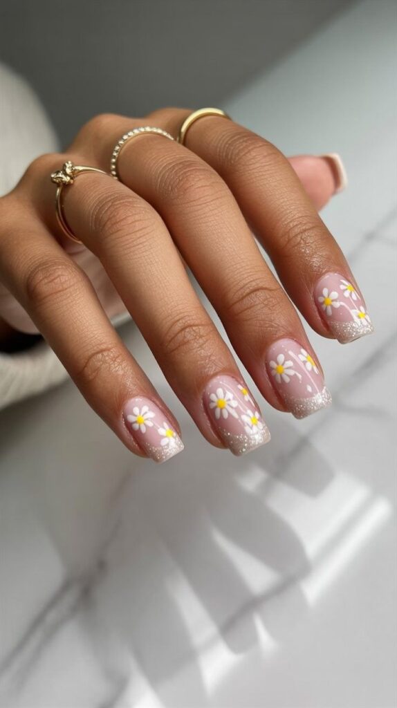 Soft blush-pink short square nails, two accent fingers featuring scattered hand-painted white daisies (yellow centers) and fine green vines—with the free edge dipped in iridescent silver glitter. The high-shine finish makes the sparkle glow, and the crisp square shape ensures modern elegance. Joyful, dimensional, and deeply wearable—like confetti caught in first light.