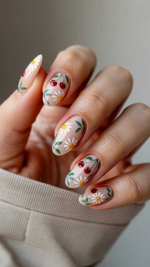Sheer nude short oval nails, two accent fingers featuring hand-painted white daisies (yellow centers) and miniature red cherries with green stems—playful, cohesive, and full of joyful contrast. The high-shine finish makes the colors pop, and the oval shape ensures comfort and elegance. Sweet, vibrant, and deeply wearable—like a picnic basket filled with light.