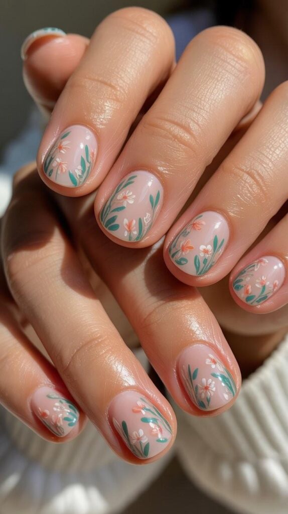 Glossy short almond nails in sheer nude base, two accent fingers featuring delicate hand-painted mini blossoms (soft pink & ivory), fine green vines, and subtle negative-space flourishes. The high-shine finish enhances the dimension, and the elongated shape flatters every hand. Poetic, minimal, and deeply calming—like roots reaching toward light.