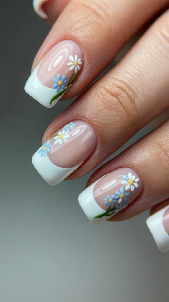 Soft nude-cream short square nails with crisp white French tips, two accent fingers adorned with hand-painted mini blue daisies (yellow centers) and fine green vine details. The glossy finish unifies the palette, and the crisp square shape ensures modern elegance. Delicate, nostalgic, and full of spring rhythm—like childhood summers reborn.