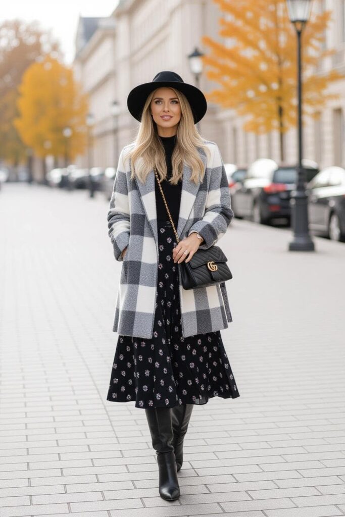 A bold gray-and-white plaid coat pairs with a black floral dress, black turtleneck, and knee-high boots. The chic contrast adds a modern, elegant flair to the autumn look.