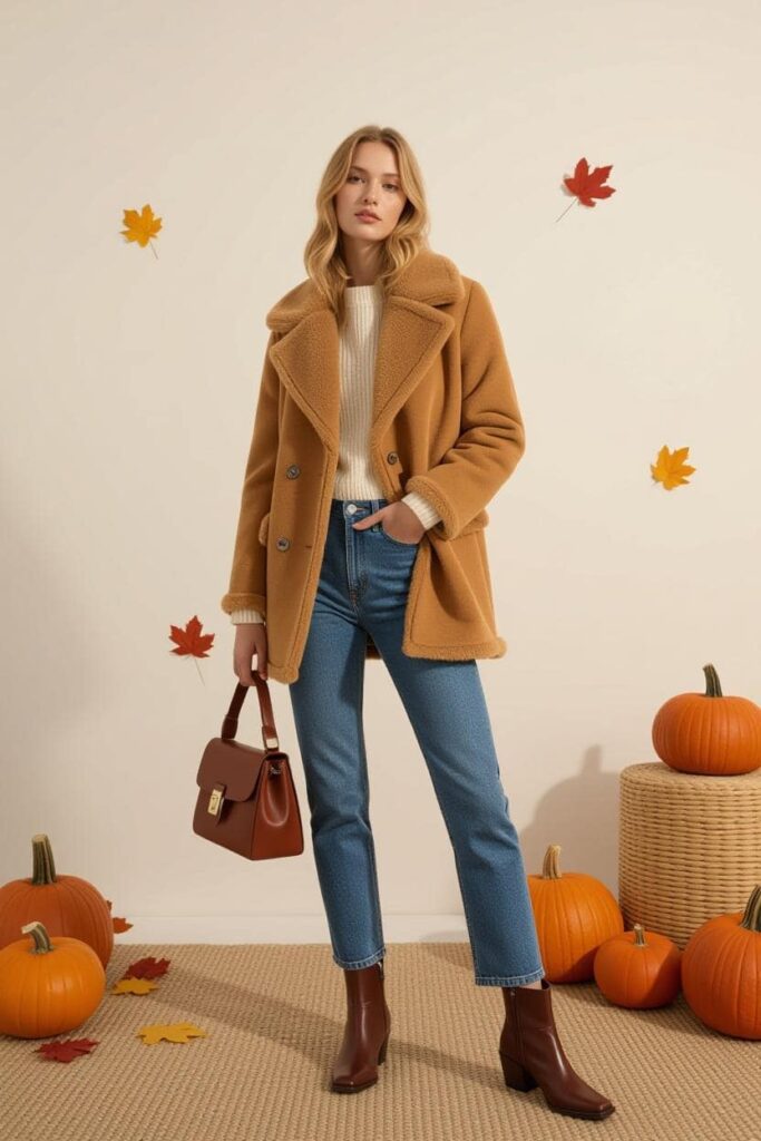 A cozy tan shearling coat teams with a cream knit sweater, straight-leg jeans, and brown ankle boots. The warm tones add a rustic, inviting charm to the casual outfit.