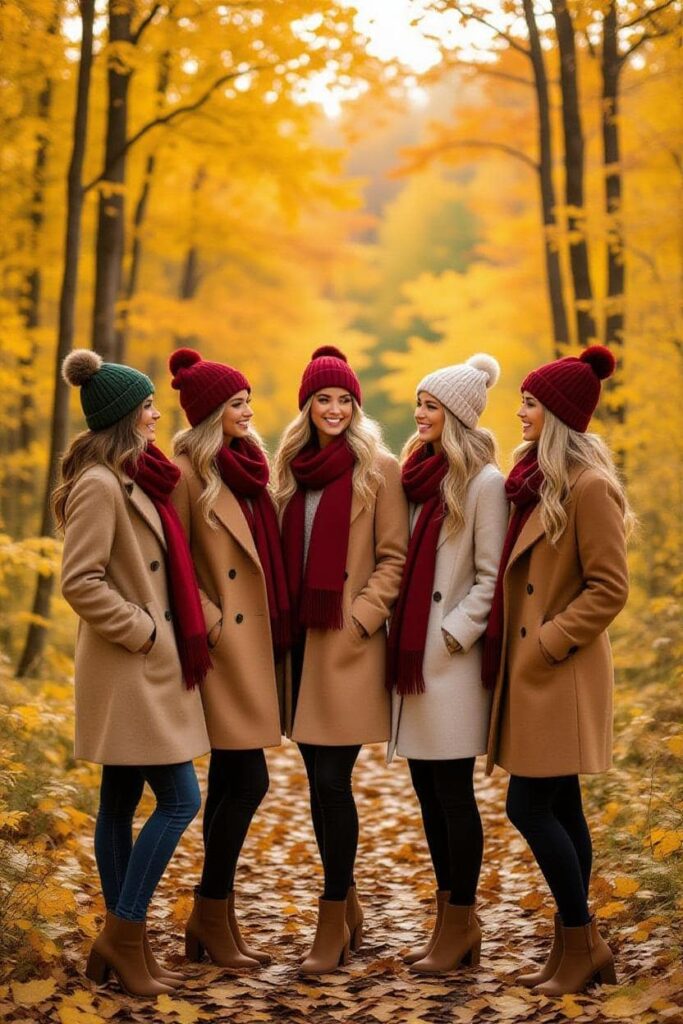 Five women in matching beige coats, burgundy scarves, and pom-pom beanies walk through a golden forest. The coordinated warmth adds a joyful, festive charm to the group style.