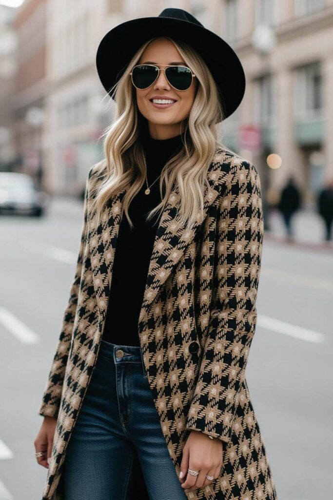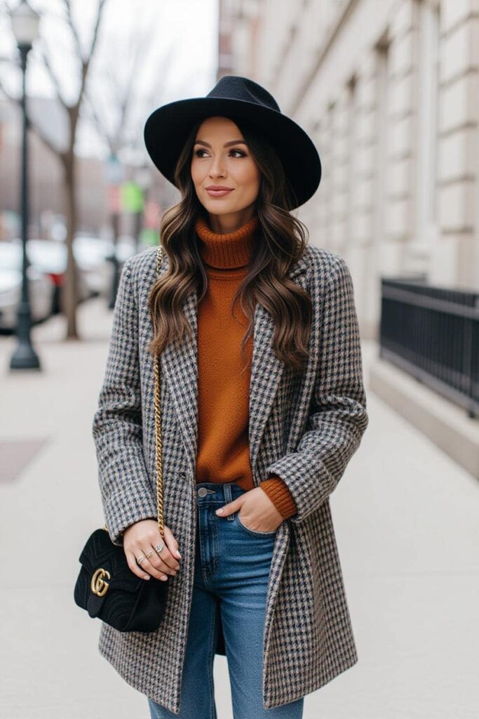 A classic houndstooth coat layers over a rust-colored turtleneck, blue jeans, and a black wide-brim hat. The warm contrast adds a cozy, autumnal charm to the timeless look.