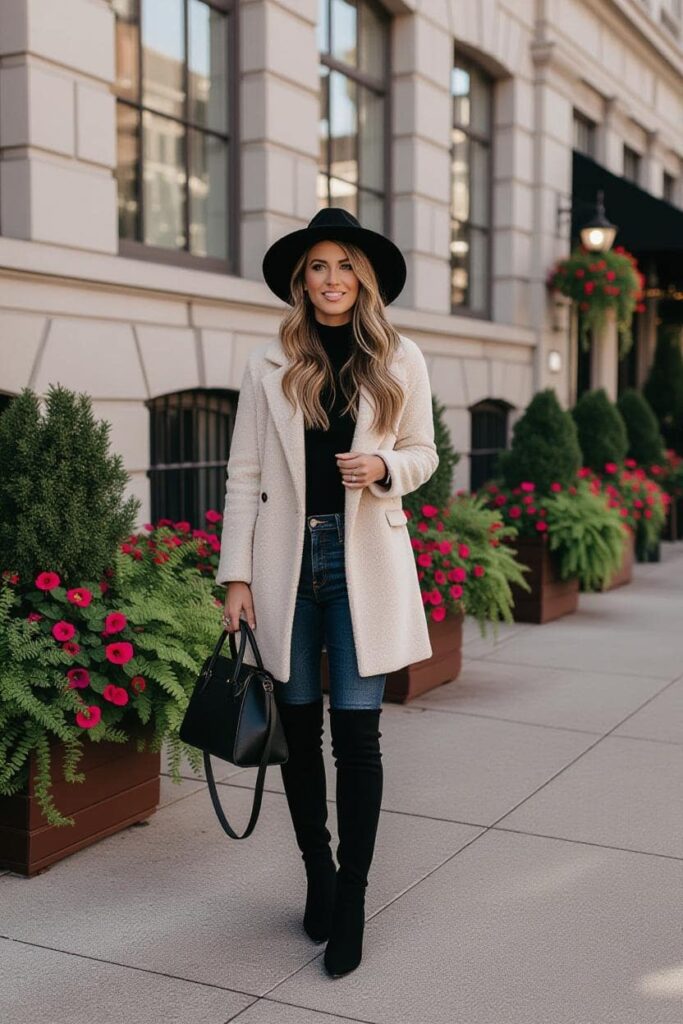 A soft cream faux fur coat layers over a black turtleneck, blue jeans, and black over-the-knee boots. The cozy texture adds a luxurious, autumnal charm to the elegant ensemble.