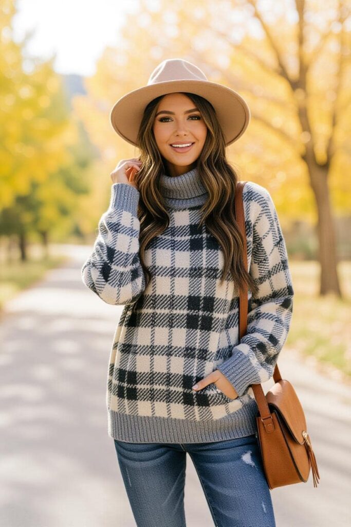 A cozy black-and-white plaid turtleneck sweater pairs with ripped jeans, a tan wide-brim hat, and a crossbody bag. The relaxed fit adds a boho-chic, fall-ready charm to the outfit.
