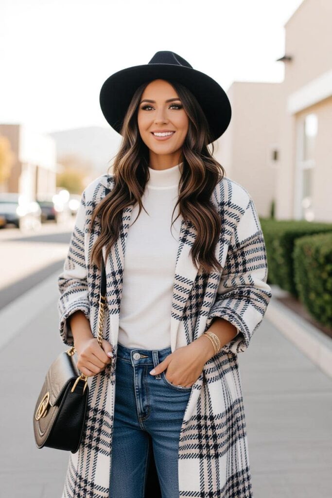 A long black-and-white plaid coat drapes over a white turtleneck, blue jeans, and a wide-brim hat. The classic pattern adds a timeless, autumnal charm to the clean silhouette.