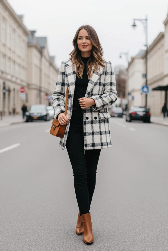 A structured black-and-white checkered blazer layers over a black turtleneck, leggings, and brown ankle boots. The sharp lines add a modern, fashion-forward edge to the minimalist outfit.