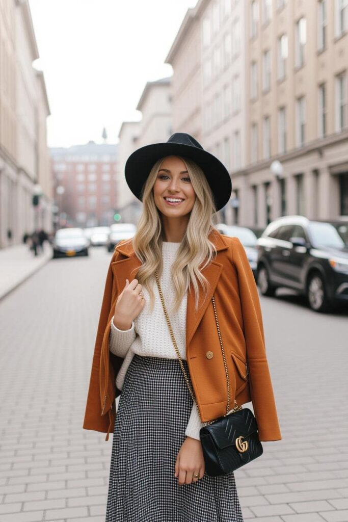 A bold burnt orange jacket teams with a white knit sweater, gingham midi skirt, and black wide-brim hat. The vibrant contrast adds a playful, retro flair to the stylish outfit.