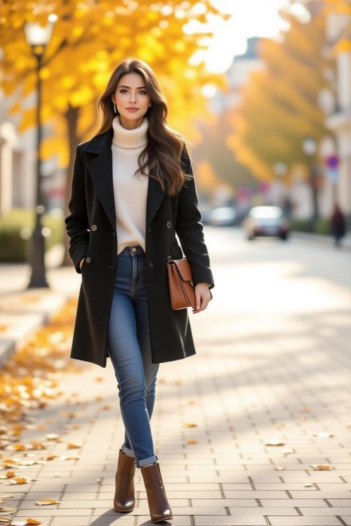 A sleek black coat layers over a cream turtleneck, blue jeans, and brown ankle boots. The clean contrast adds a modern, minimalist charm to the effortlessly cool look.