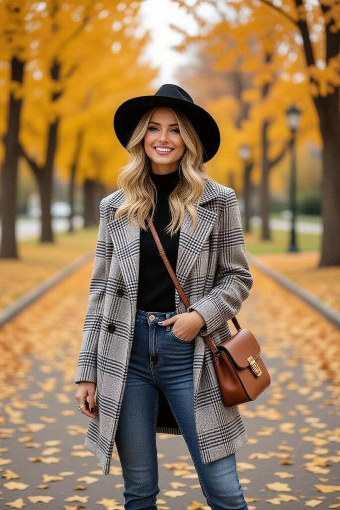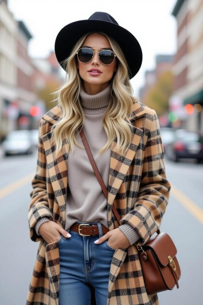 A structured gray plaid coat layers over a black turtleneck, blue jeans, and a wide-brim hat. The classic pattern adds a timeless, cozy charm to the city-ready ensemble.