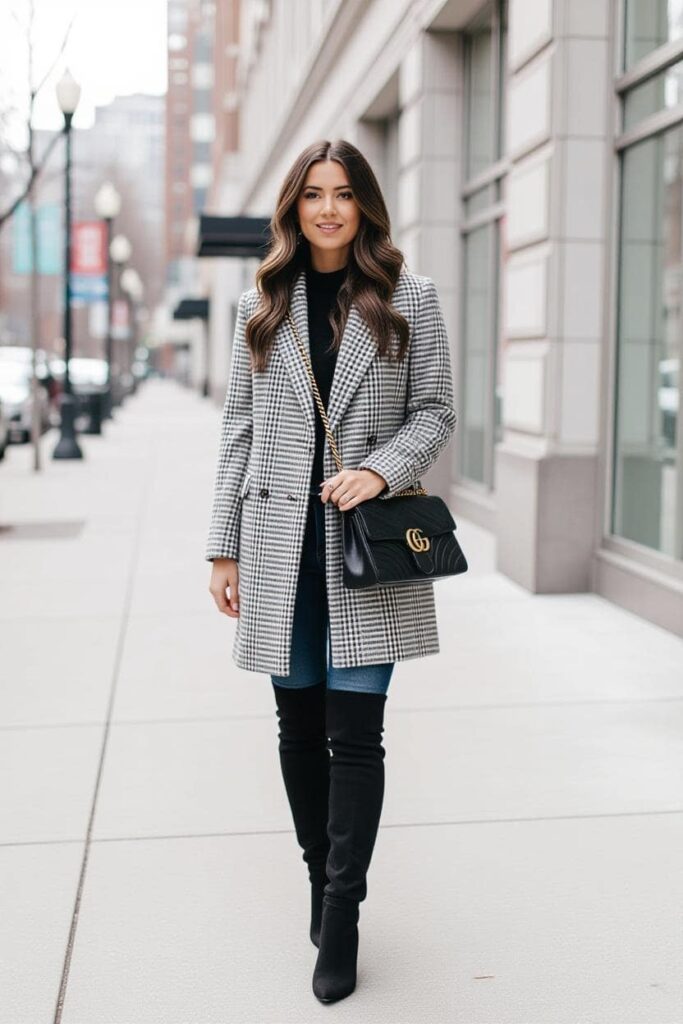 A structured houndstooth coat drapes over a black turtleneck, blue jeans, and black over-the-knee boots. The bold contrast adds a modern, fashion-forward edge to the sleek silhouette.