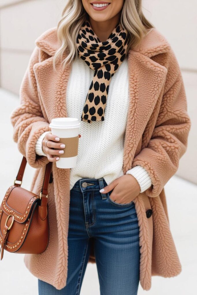 A plush blush faux fur coat teams with a white knit sweater, blue jeans, and a leopard-print scarf. The soft texture adds a luxurious, autumnal charm to the casual outfit.