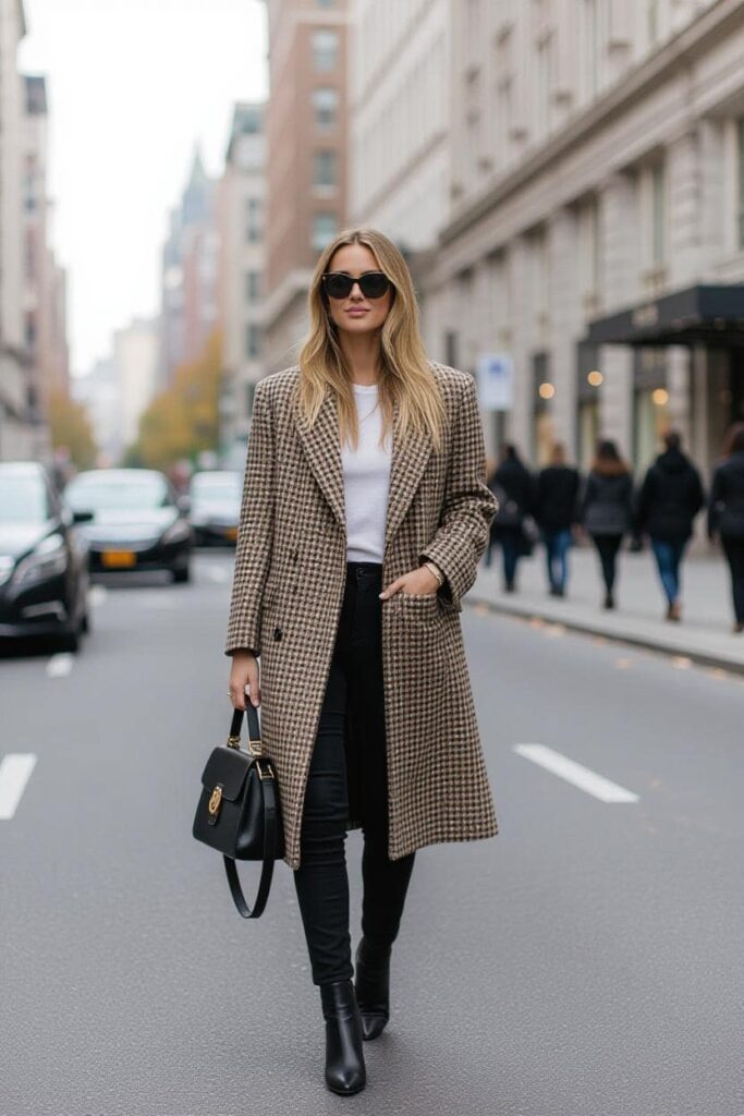A long houndstooth coat drapes over a white top, black pants, and ankle boots. The sharp contrast adds a polished, downtown-chic vibe to the monochrome ensemble.