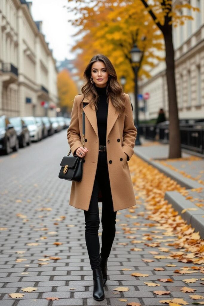 A long camel coat drapes over a black turtleneck, high-waisted leather pants, and ankle boots. The sleek contrast adds a modern, minimalist flair to the city-ready look.