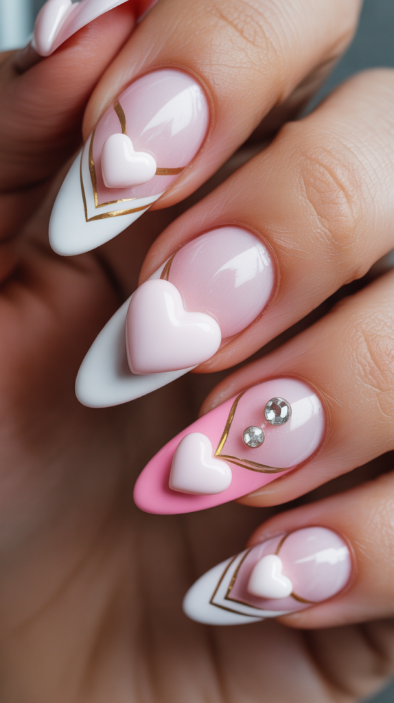 Soft blush pink and creamy white polish meet delicate 3D hearts, framed by dainty gold chevrons and sparkling rhinestones — like a love letter written in nail art. The glossy finish catches every glint of light, making it perfect for date nights or gifting yourself a little romance. Paired with sharp stiletto shapes, this design whispers ‘I adore you’ with every gesture. Perfect For: Valentine’s Day dates, engagement photos, Galentine’s brunches, or anyone who wants their nails to feel like a sweet, luxurious hug.