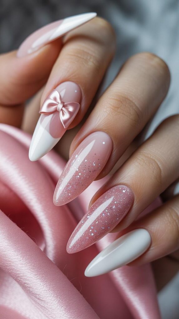 Soft blush pink fades into sheer white at the tips, with two accent nails featuring sculpted satin bows that look good enough to touch. The glittery finish adds sparkle, making it perfect for snowy dates or cozy nights in. Paired with a pink satin backdrop, this design whispers ‘romance’ with every glance.