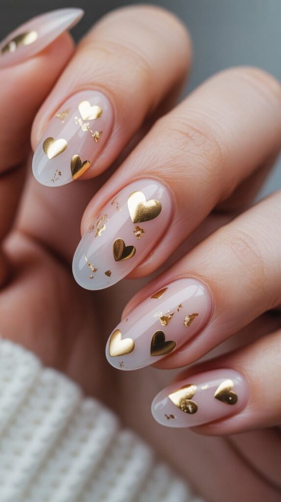 Soft sheer pink polish meets scattered gold foil hearts — playful, romantic, and perfect for showing off your engagement ring. The glossy finish makes it pop without overpowering your look, while the cozy knit sweater backdrop adds warmth and charm.