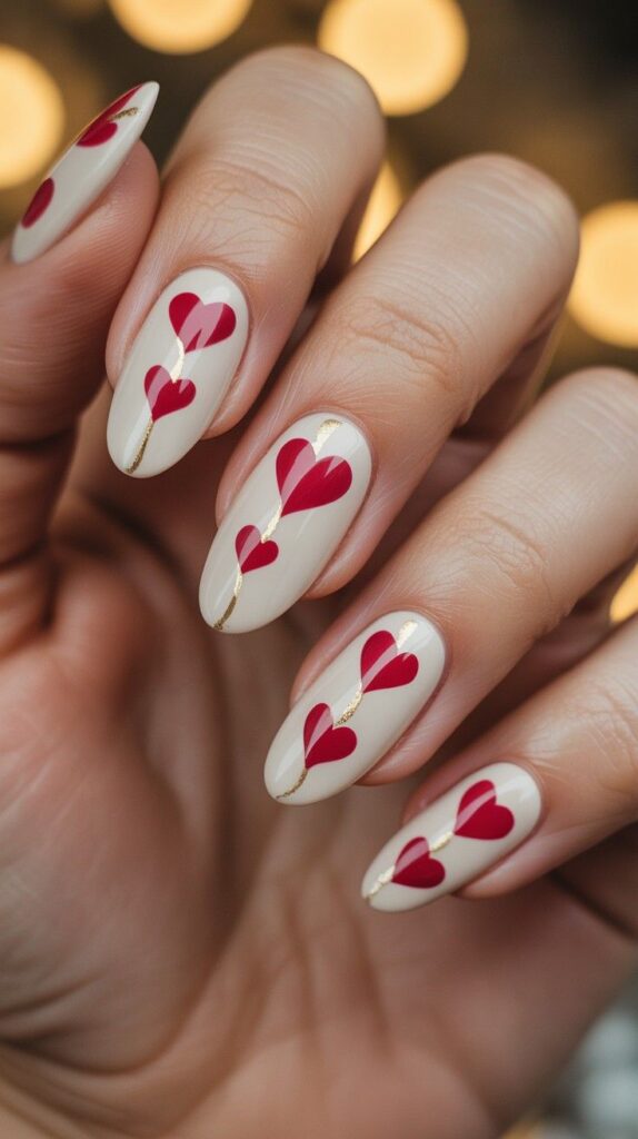 Creamy white nails are adorned with bold red hearts connected by delicate gold lines — like a love letter written in ink and glitter. The glossy finish catches every glint of light, making it perfect for candlelit dinners or surprise proposals. The bokeh background adds dreamy romance.