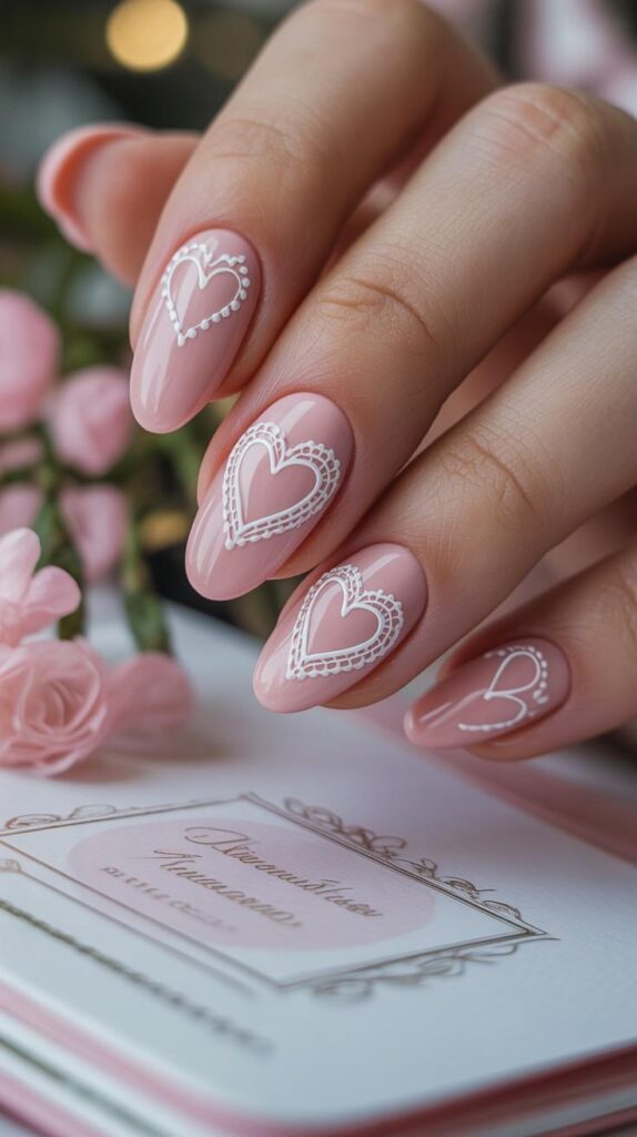 Soft blush pink nails are adorned with delicate white lace heart outlines — like a love letter written in thread. The glossy finish catches the light, making it perfect for photos, vows, and first dances. Paired with pink roses and a vintage invitation, this design whispers ‘romance’ with every glance.