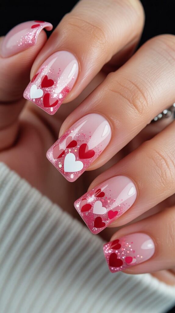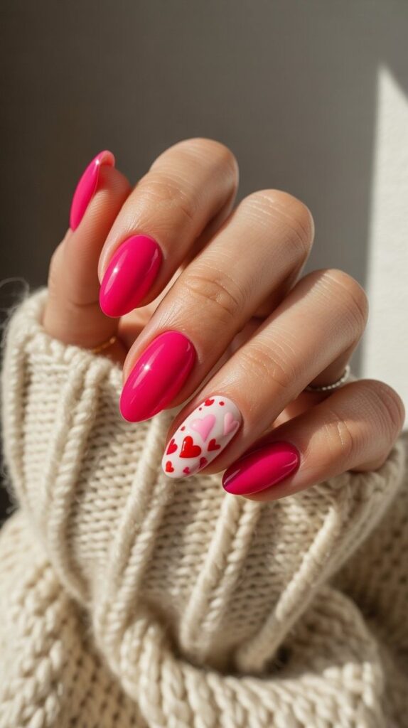 Bold hot pink polish meets crisp white tips, but here’s the twist: one nail features a cluster of hearts in varying shades of pink — playful, romantic, and perfect for showing off your engagement ring. The cozy knit sweater backdrop adds warmth and charm.