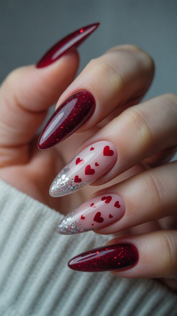 Deep red glitter nails meet soft pink bases, with scattered red hearts adding a touch of romance. The glossy finish gives it a modern, edgy vibe — perfect for night owls or starry-eyed dreamers. The sharp stiletto shape elongates the fingers — ideal for holding bouquets or showing off your ring.