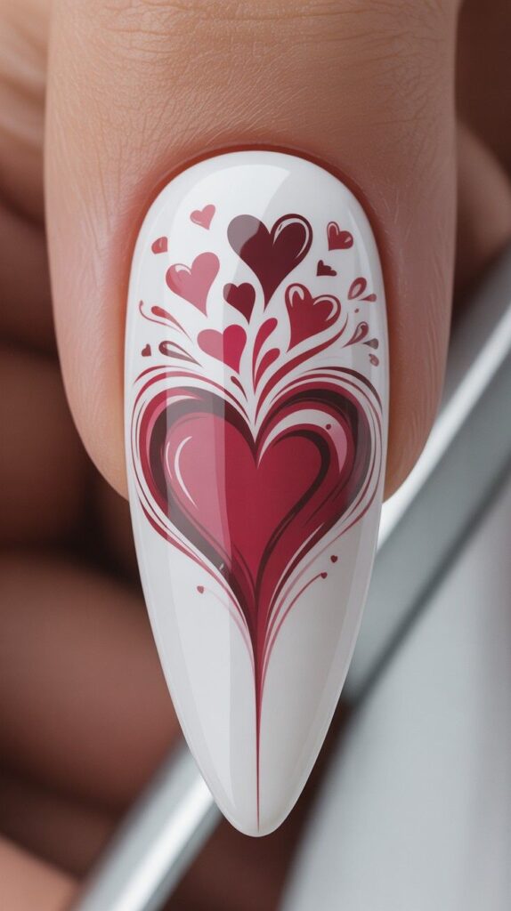 Pure white almond nails gleam with high-gloss polish, while one accent nail features a bold red heart explosion — swirling, dramatic, and perfect for evening receptions. The glossy finish catches every glint of light, making it ideal for photos, vows, and first dances.