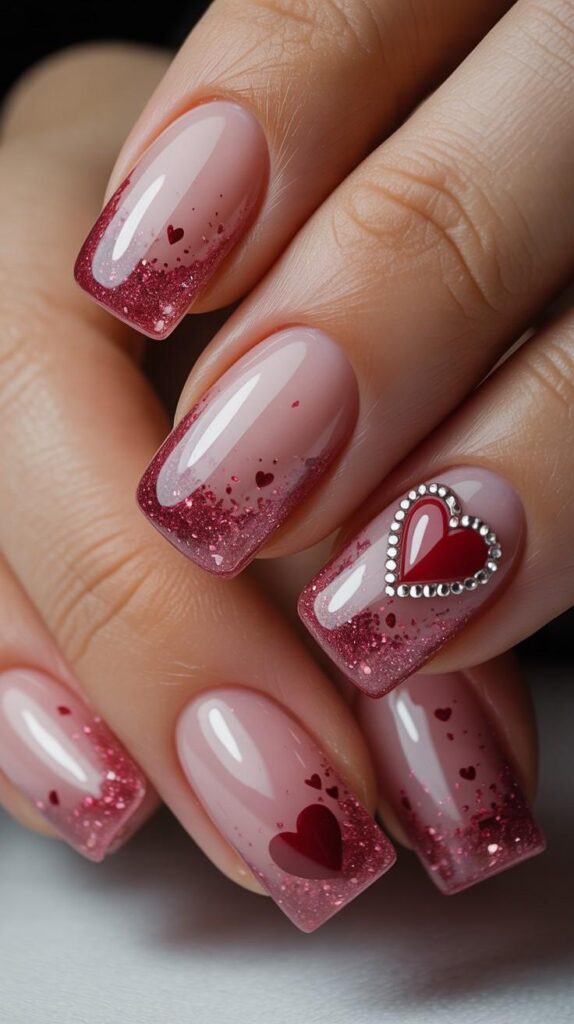 Deep red glitter nails meet soft pink bases, with one accent nail featuring a bold red heart framed in rhinestones — playful, romantic, and perfect for showing off your engagement ring. The glossy finish catches every glint of light, making it ideal for Valentine’s dates or Galentine’s brunches.