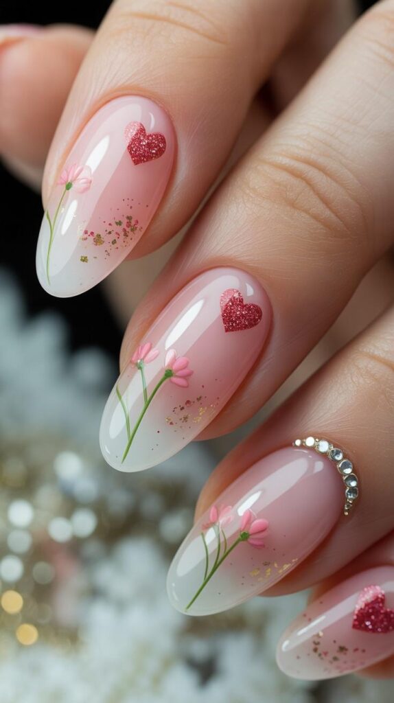 Soft pink polish meets hand-painted pink flowers with green stems, accented with scattered glitter hearts and rhinestones — like a garden wedding captured in miniature. The glossy finish catches every glint of light, making it perfect for spring dates or cozy nights in.