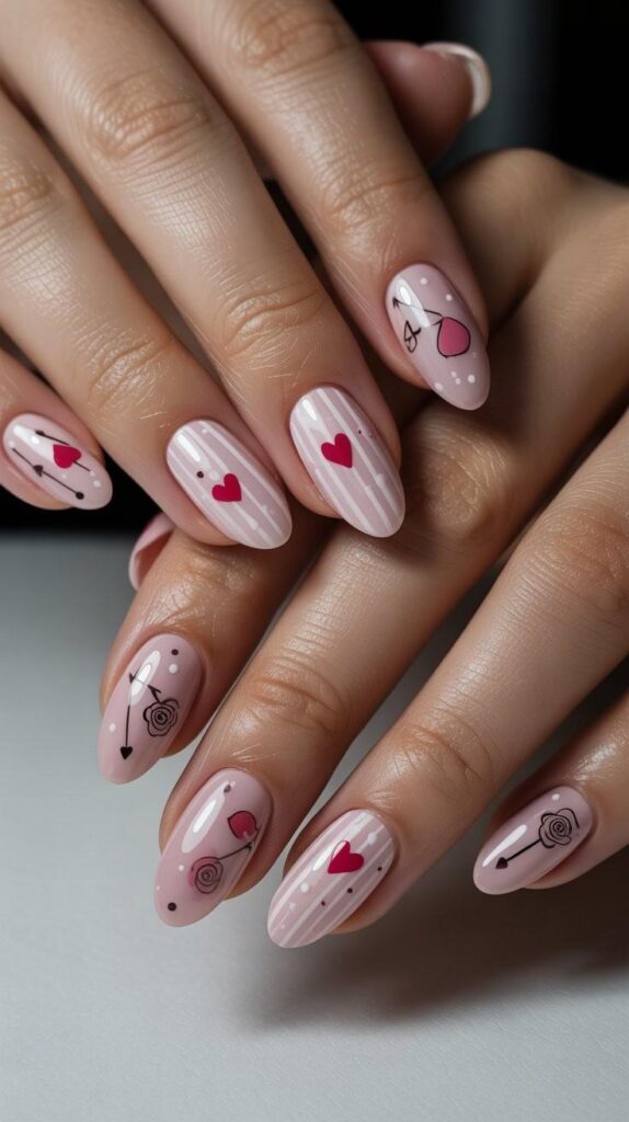Soft pink polish meets crisp white stripes, with two accent nails featuring tiny arrows and roses painted in rose gold — playful, romantic, and perfect for showing off your engagement ring. The glossy finish makes it pop — elegant, romantic, and perfect for evening receptions.