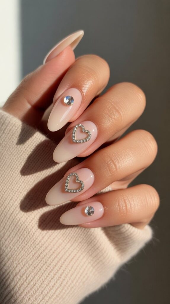 Soft nude polish meets crisp white tips, but here’s the twist: two accent nails feature delicate heart outlines paved with micro-rhinestones, while others showcase single sparkling gems nestled near the cuticle. The glossy finish catches every glint of light, making it perfect for showing off your engagement ring or stealing the spotlight at dinner.