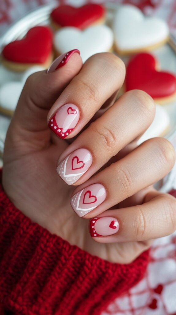 Soft pink polish meets bold red hearts painted in a playful, hand-drawn style — inspired by Valentine’s Day cookies. The glossy finish makes it pop like a sweet treat, while the red sweater backdrop adds cozy romance. Perfect for Galentine’s brunches or surprise proposals.