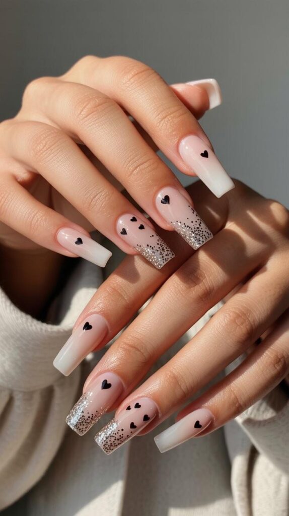 Clean white nails meet soft nude bases, with two accent nails featuring black hearts and silver glitter tips — modern, chic, and perfect for showing off your engagement ring. The matte-to-glossy gradient adds depth, while the minimalist base lets the design shine.